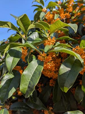 ![]() | 9月も半ばになりましたが、まだまだ暑い日が続いています。そんな中、ふわっとキンモクセイの香りがしました。木の中をよく見てみると小さな花がいくつか咲いていました!小さい秋を見つけて、少し嬉しくなりました。 次回の法要は9月28日(日)、秋のお彼岸法要です。皆さまにお会いできる事を楽しみにしています。 2025年9月17日 |